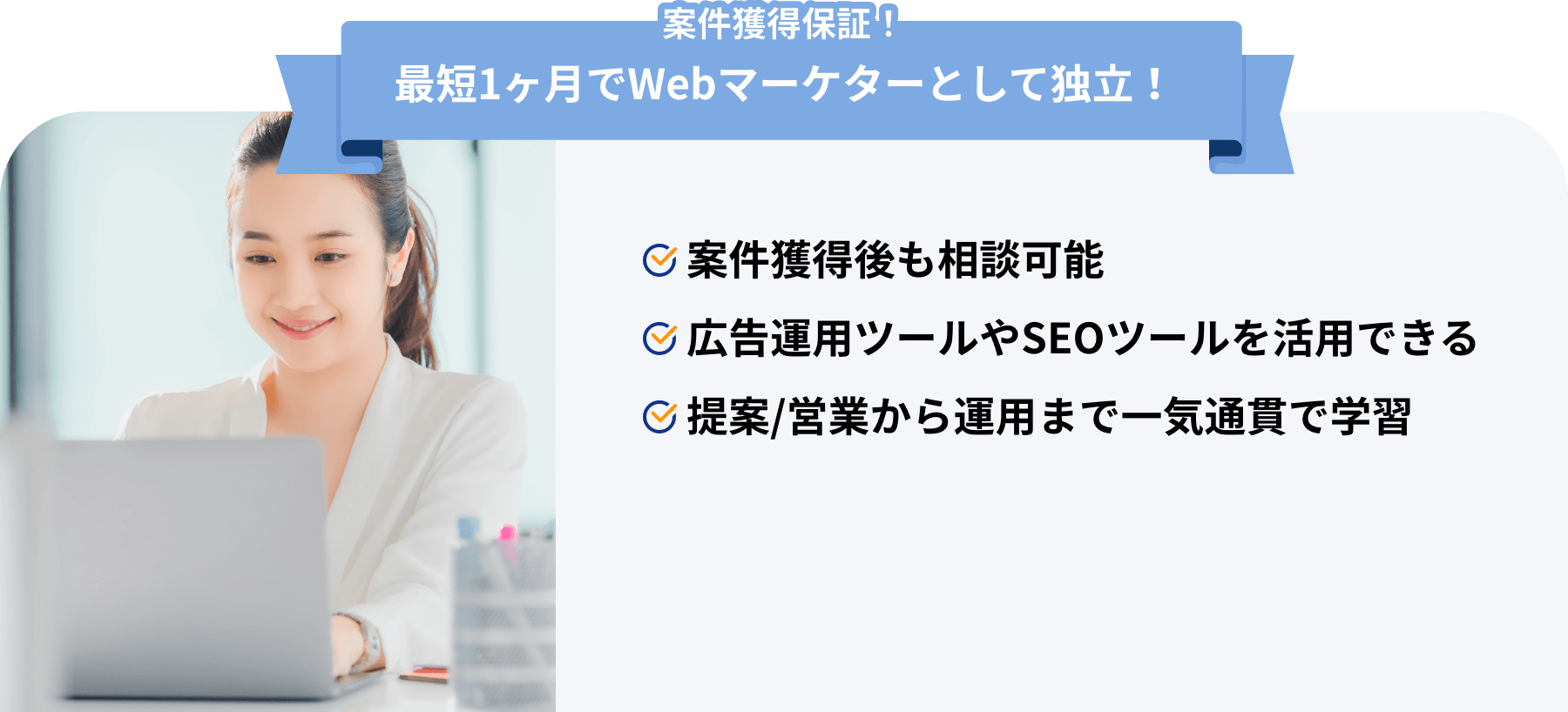 当スクールでは、SEO対策、リスティング広告、SNS運用、コンテンツマーケティング、メールマーケティング、アナリティクス解析など、Webマーケティングの主要な分野を網羅したカリキュラムを提供しています。